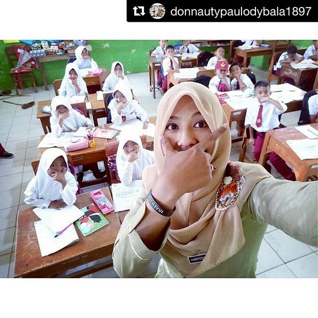 Menariknya pose itu dilakukan Husnul Khotimah di ruang kelas bersama anak-anak didiknya.