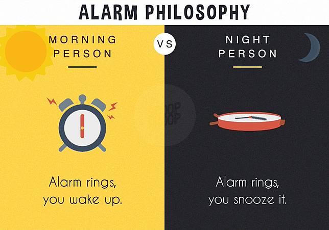 Filosofi alarm yang dianut oleh morning person dan night person tuh beda. Yang satu langsung bangun begitu denger alarm bunyi, sedangkan yang tim satunya lagi hobi banget nunda alarm saat bunyi.