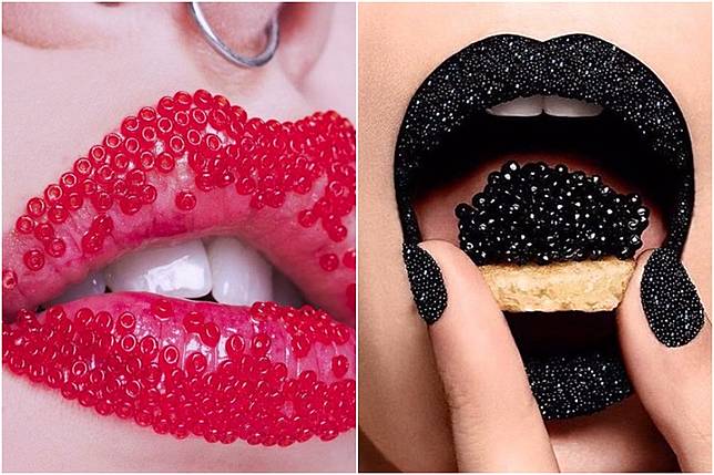 Tren lisptik ini memang tak membutuhkan caviar atau telur ikan asli. Melainkan hanya manika-manik berukuran sangat kecil yang ditempelkan pada bibir. tapi, tetap saja ya tren lipstik ini sangat aneh.