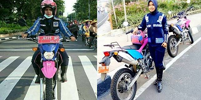 Sosok wanita cantik berjilbab kebagian membawa Risma berkeliling dengan motor Kawasaki KLX150 BF yang berkelir pink.