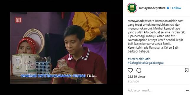 "Ramadan adalah saat yang tepat untuk meneduhkan hati dan menenangkan diri. Melihat kembali apa yang sudah kita perbuat selama ini dan tak lupa berbagi, menuju keren nan fitri. Namun apalah artinya keren sendiri, lebih baik keren bersama sanak famili. Keren Lahir ada Ramayana, Keren Batin berbagi bahagia." Begitu pesan Ramayana dalam akun officialnya @ramayanadeptstore yang diunggah sehari lalu.