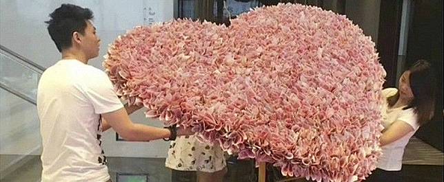 Dilansir dari South China Morning Post dengan mengutip berita hari Kamis dari Chongqing Morning Post, buket bunga cinta berbentuk hati tersebut terbuat dari 3.344 uang kertas 100 yuan. Jika dikonversikan ke dalam rupiah maka buket uang tersebut bernilai sekitar 735 juta rupiah.