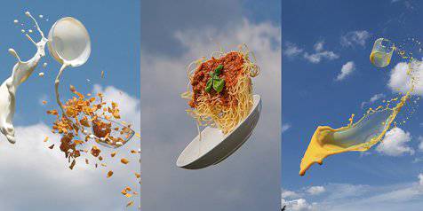 Dengan melempar objeknya ke udara tercipta komposisi unik. Ia juga harus bekerja cepat menangkap momen makanannya di udara.