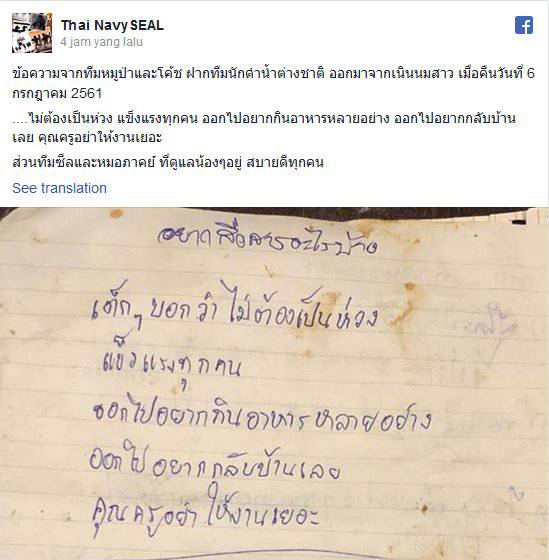 Surat-surat anak-anak gua Thailand diunggah di laman Facebook resmi angkatan khusus bersenjata pada Sabtu pagi, segera setelah mereka menerimanya pada Jumat malam.