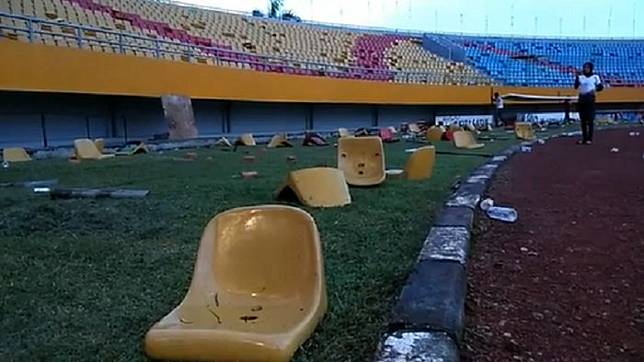 Sebanyak total 335 kursi single seat Stadion Gelora Sriwijaya dilempar ke dalam lapangan oleh sejumlah oknum suporter tak bertanggung jawab.