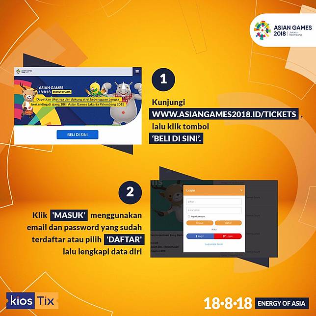 Kunjungi laman Asiangames2018.id/tickets, lalu klik tombol "BELI DISINI". Klik "MASUK" menggunakan email dan password yang sudah terdaftar atau pilih "DAFTAR" jika belum pernah mendaftar, kemudian lengkapi data diri kamu secara benar sesuai kartu identitas resmi.
