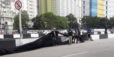 BERITA LUCU INDONESIA - Pemasangan jaring hitam yang menutupi Kali Item di samping Wisma Atlet Kemayoran masih berlanjut pada Jumat (20/7/2018).