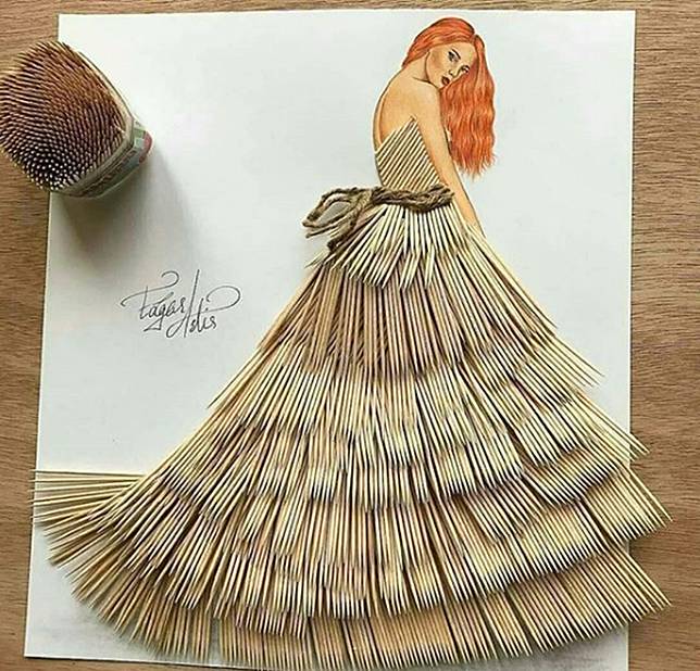 Kalau dilihat dari jauh, kita enggak akan menyangka bahwa ilustrasi dress ini terbuat dari puluhan bahkan ratusan tusuk gigi. Bentuknya rapi dan detail banget! Bahkan, beberapa tusuk gigi harus dipotong untuk menyesuaikan bentuk gambar. Kebayang kan, susahnya seperti apa girls?