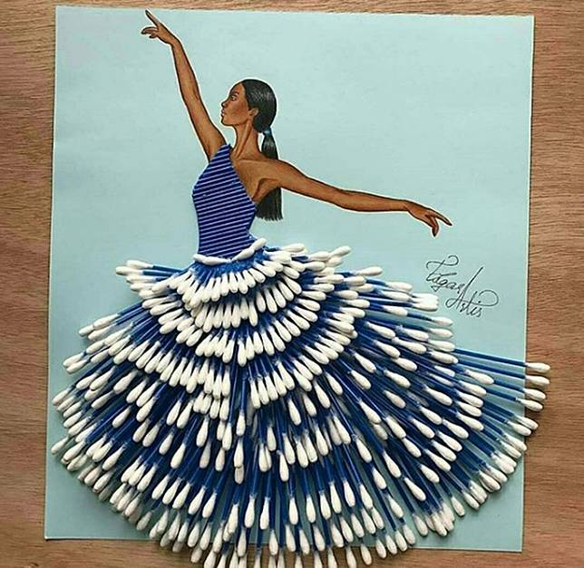 Tahu kan, bahwa cotton bud sebenarnya enggak terlalu baik digunakan untuk membersihkan telinga? Nah, daripada mubazir, asah kreativitas kamu untuk membuat sesuatu dari girls! Contohnya, ilustrasi dress biru ini yang seluruh bahan utamanya terbuat dari cotton bud. Cantik banget ya!